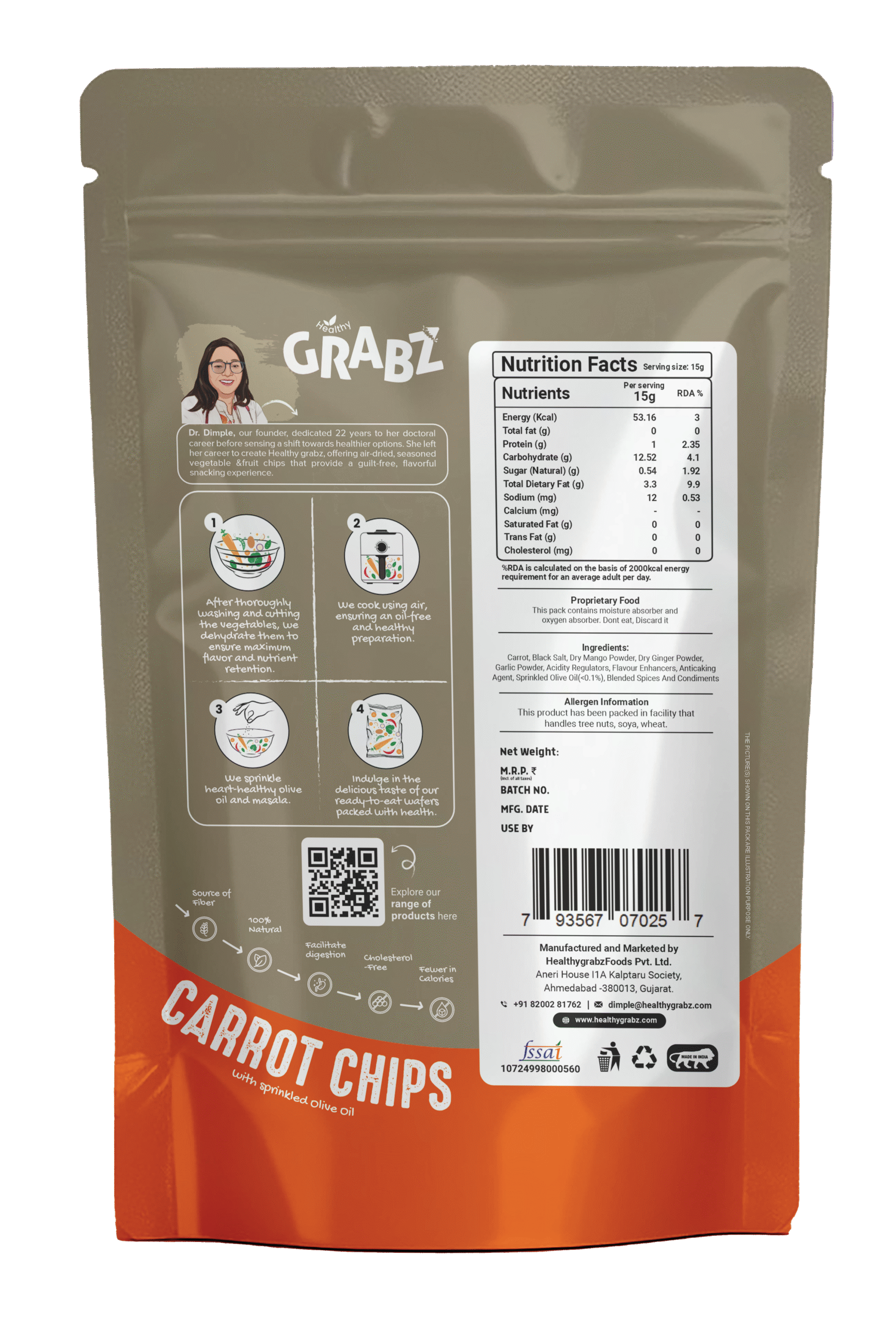 Naturally crunchy and bursting with nutrients, these Carrot Healthy Chips deliver a tasty boost of beta-carotene and antioxidants.These chips are crafted using air-cooking methods with less than 0.1% olive oil, offering a clean and flavorful snack. They support your eyes, immunity, and skin— all without any bad fats or added guilt.