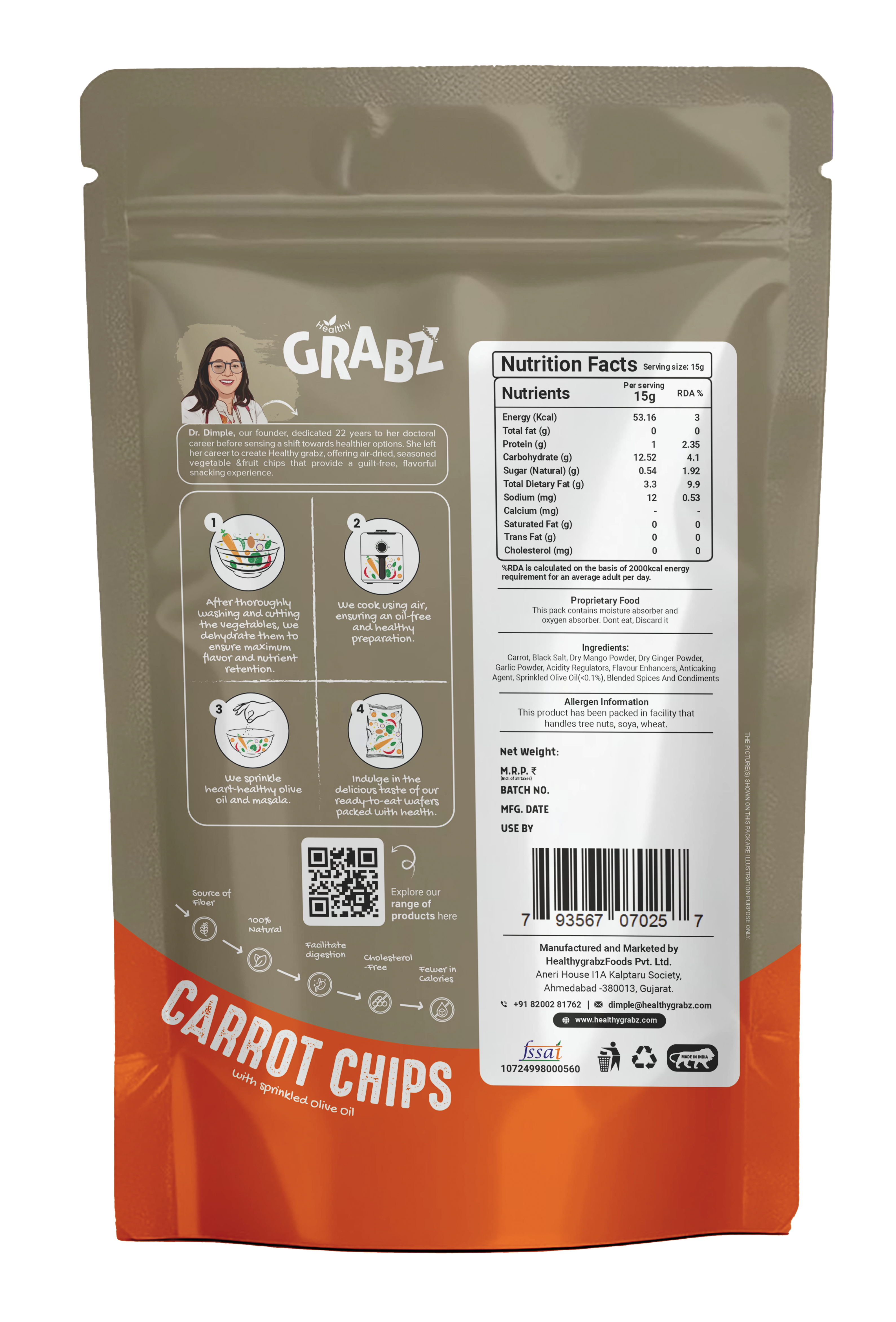 | Ingredients | Carrot Slices, Apple Slices, Beetroot Slices dried Mango powder, black Salt powder, black Pepper powder, Iodized Salt, blended spices and condiments, Red Chili powder, Turmeric powder, Coriander powder, Cumin powder, Cinnamon powder, cold-pressed Olive oil (<0.1%, 2 to 3 ml used for every 1 kg material) at room temperature |